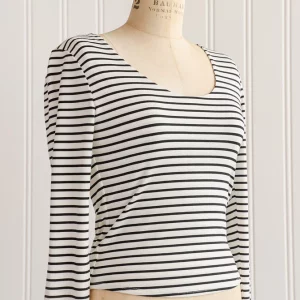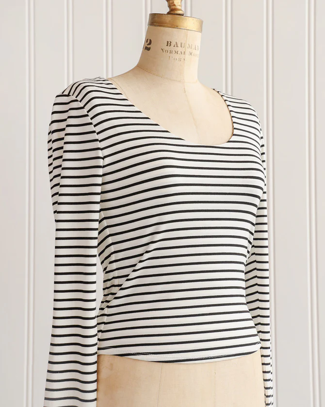 Super soft vintage inspired classic black and white striped long sleeved top featuring scoop neckline and slightly fitted silhouette. Perfect with your favorite black midi skirt or dark wash jeans for a look that is very French.