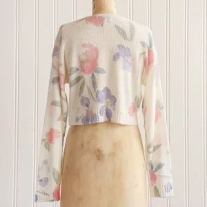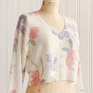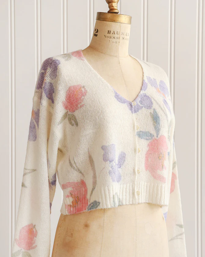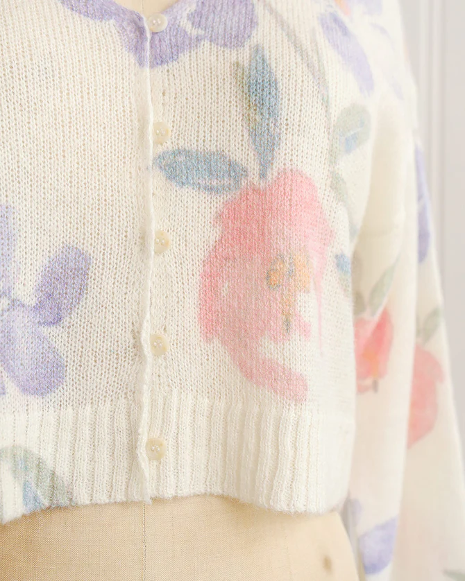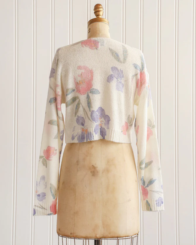 Vintage inspired pastel floral button down cardigan sweater featuring v-neckline, long sleeves that slightly flare, and slightly cropped fit.
