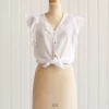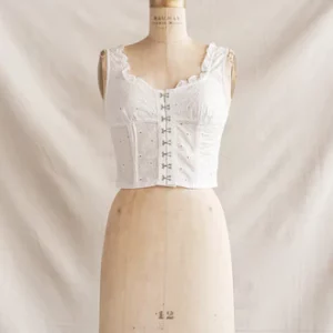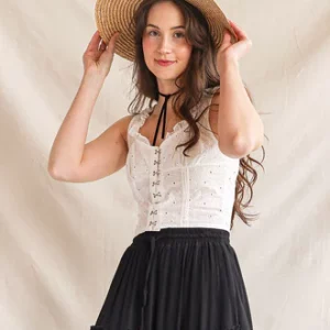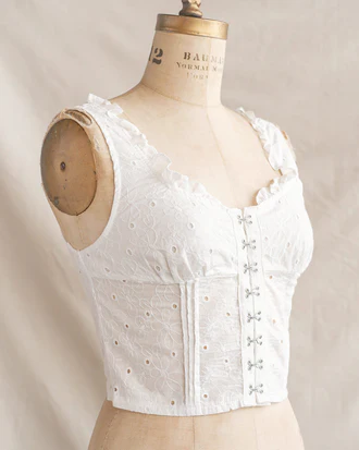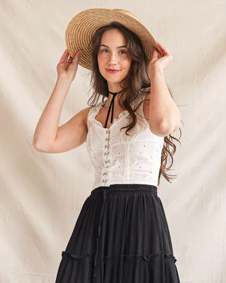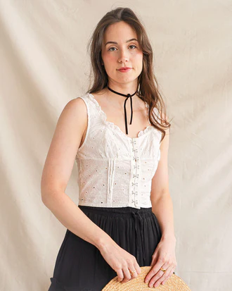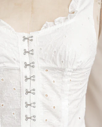 Feminine and romantic vintage inspired white cotton floral eyelet top with hook and eye closures along the front, smocked elasticated panel in back, and ties at back neckline. Semi cropped.