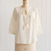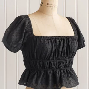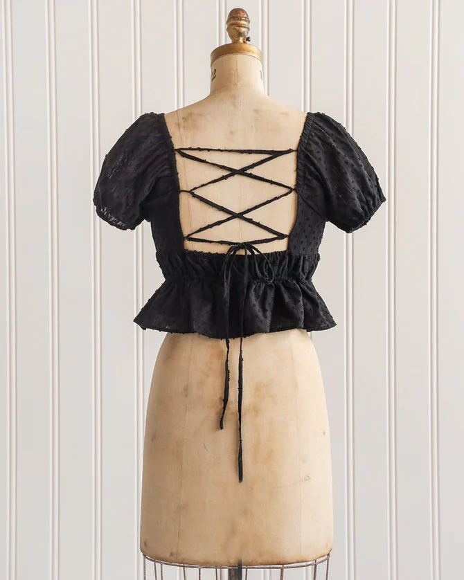 Romantic and feminine vintage inspired black swiss dot textured cotton peasant top featuring wide squared neckline, short puffed sleeves, elasticated shirred bodice, and lace up open back.